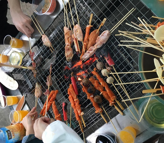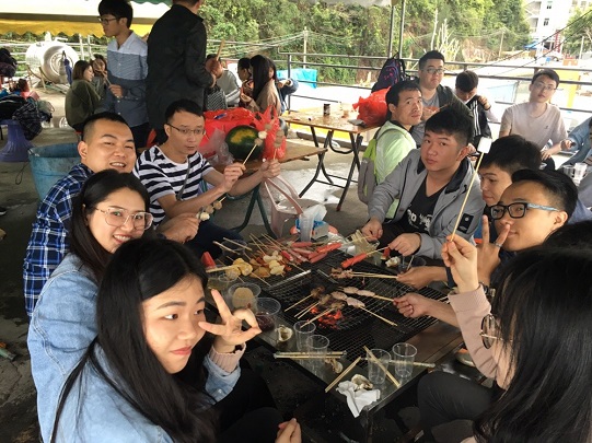 活动现场,大家分工行动,洗菜、切菜、烧肉、拍照,忙得不亦乐乎,都在为了午餐而各显身手。有些同事的烧烤技术实在不敢恭维,把肉都烤成了“黑炭”;有的同事相当出色,看他们烤出来的肉、鸡翅,不仅色泽诱人,而且香飘四溢!大家烤得认真,吃得津津有味,烧烤与饮料搭配,歌声与欢笑点缀,显露出点点社交游戏人之间单纯的情谊;你一言、我一语,让成员们认识了彼此,也熟悉了彼此。