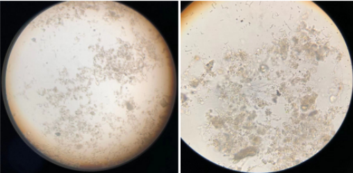 (镜检污泥絮体细碎,可见少量轮虫及表壳虫,钟虫等原生动物较少 )