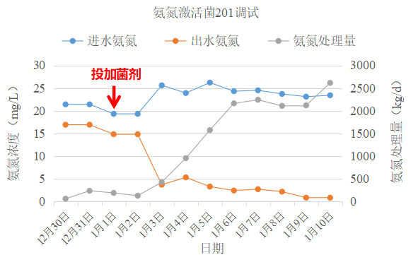 库巴鲁氨氮激活菌201投加3日后出水氨氮开始降低,系统硝化能力明显好转
